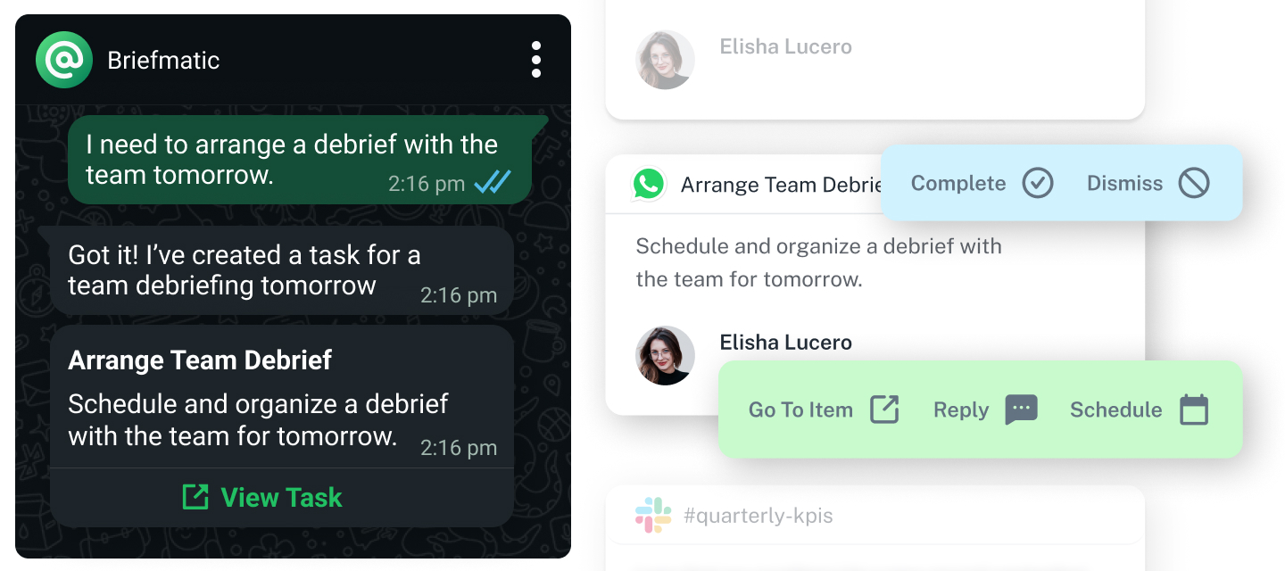 Briefmatic is a task manager that connects you with tasks via WhatsApp™ and your favourite collaboration apps.